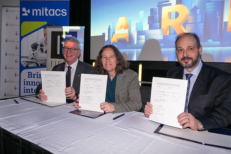 From left to right: Stephen Lucas (CEO, Mitacs), Deirdre Haskell (Director, Fields Institute) and Eyal de Lara (Professor and Chair, U of T 海角视频 of Computer Science) at the signing ceremony on November 13, 2025. (photo: Jeff Beardall)